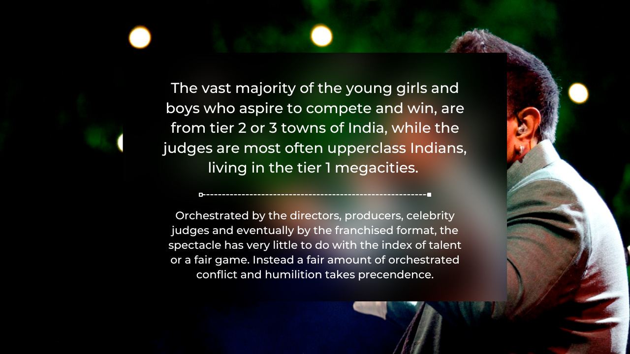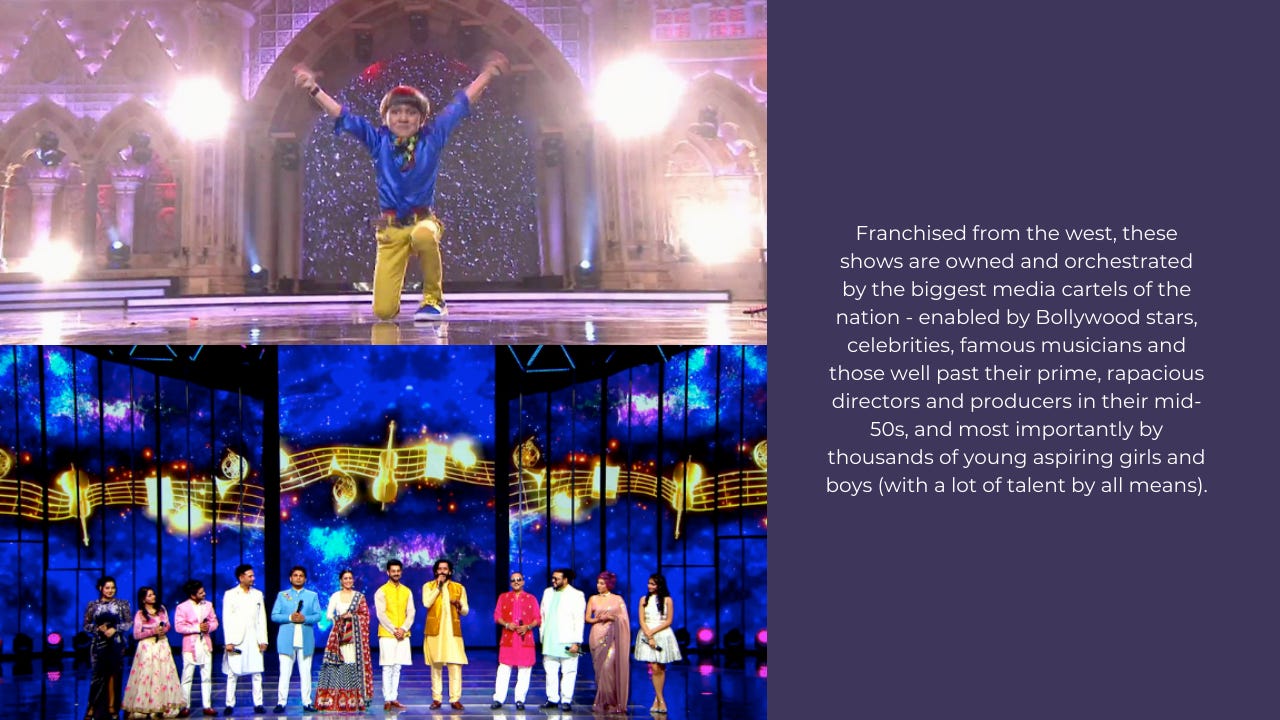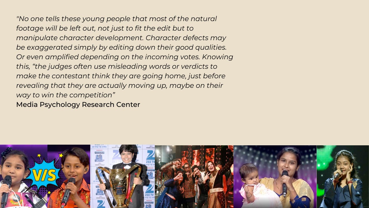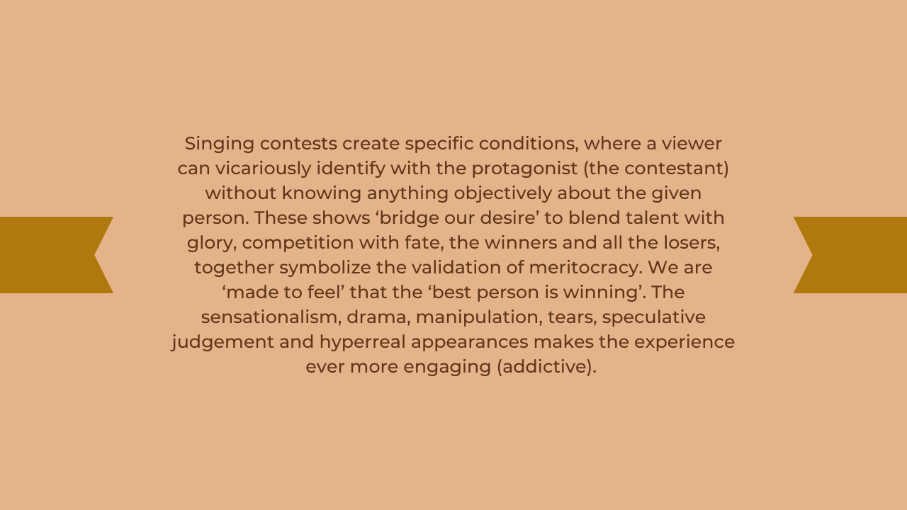 Singing contests create specific conditions, where a viewer can vicariously identify with the protagonist (the contestant) without knowing anything objectively about the given person. These shows âbridge our desireâ to blend talent with glory, competition with fate, the winners and all the losers, together symbolize the validation of meritocracy. We are âmade to feelâ that the âbest person is winningâ. The sensationalism, drama, manipulation, tears, speculative judgement and hyper real appearances makes the experience ever more engaging (addictive). The conversion of raw talent into battle-size entertainment in HD. The economic success of these talent shows, extends itself pan-society, to exploit children as young as 9 years old (Sa Re Ga Ma Pa Lil Champs). The parents, audience, production gurus and team implicitly responsible for exposing these children to âvalues based solely on appearanceâ and âunrealistic prospects of successâ plus other negative implications (IPL Academic Research Base)