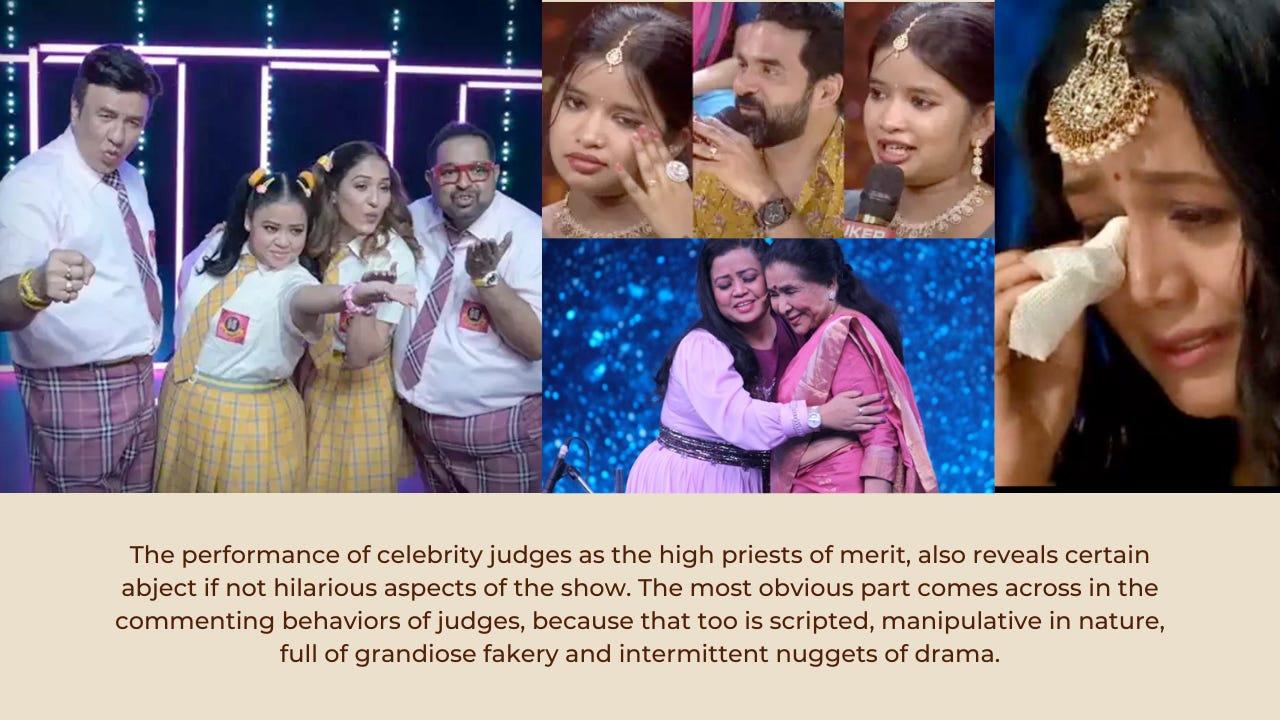 The performance of celebrity judges as âhigh priests of meritâ also reveals certain abject if not hilarious aspects of these shows. The most obvious part comes across in the commenting behaviors of judges, because that too is scripted, manipulative in nature, full of grandiose fakery and intermittent nuggets of drama. These highly adored public figures, also develop a preference only for things that they are familiar with. Their artistic sensibilities actually bound inside very conventional standards. As a consequence, the act of evaluation has already been outsourced to external factors, which ensure the popularity, participation and continuity of the given show. A majority of the Bollywood icons who judge these talent shows are often past their career prime, and essentially are actors, made to heap effusive praise or pointless criticism, rather than any objective evaluation or real tutorship. Dare I say, that most of them are double-standard personas.