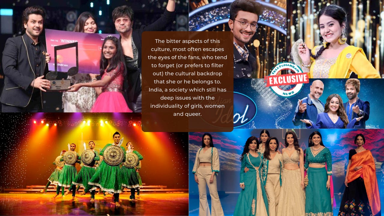 âA large part of sponsored media, cherrypicks stereotypical beautiful (thin people) as âidealâ. Underweight and/or slim but curvy models, teenagers and even children acting out in millions of adverts. The regime of perfection is tacit, and it impacts us all. Even as woke advertising pundits include Africans, Chinese, Indians, Chubby etc, the regime of perfection plays out as is. The exposure to all pervasive visual propaganda has the strongest (negative) effect on teenagers and children, in certain cases as young as 4 to 5 years old... the exposure effect disempowers them over time and making them vulnerable to media based manipulation, at a mental and physical level...â from a new article by A. Morin (psychologist, writer). Similar to Reality TV (Big Brother, MTV Splitsvilla, Nach Baliye etc), the distraction lies in distortion, emotional fakery and big doses of exaggeration. One which takes the viewer and the aspiring talent away from the supposed objective - about how good is oneâs voice? How hard have they worked to reach this alter of national prestige? What doesnât happen naturally often is added by the producers, script writers and editors. Because regardless of all the hype and hoopla, there are no real standards or means to value (judge) any two (or more) competing voices. That too under 3 minutes, even if itâs voted in or out by millions of people.