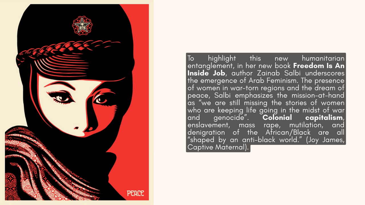 To highlight this new humanitarian entanglement, in her new book Freedom Is An Inside Job, author Zainab Salbi underscores the emergence of Arab Feminism and local disruptions. The presence of women in war-torn regions and the dream of peace, Salbi emphasizes the mission-at-hand as âwe are still missing the stories of women who are keeping life going in the midst of war and genocideâ. Colonial capitalism, enslavement, mass rape, mutilation, and denigration of the African / Black are all âshaped by an anti-black world.â (Joy James, Captive Maternal). That âcaptivityâ of the past transformed again and again, and so did the war against the most vulnerable to violence, war, poverty, police, and most often returning to organized captivity. The surge in raids, arrests, detentions and deportations executed by ICE, is probably the best contemporary example one can offer, to highlight Joy James âCaptive Maternalâ.