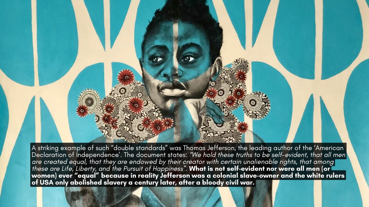 âDouble standardsâ were and still are typical of colonial power and its mainstream discourse. While certain European historians continue to insist that the âphilosophy of enlightenmentâ was coeval to slave trade and the making of several empires, âthey seldom concur about the European legacy which denied, its own subjects with darker skin color, the so called democratic rights and opportunities.â (Achille Mbembe, Necropolitics). Imperial powers fostered racism, and they still do via less obvious means. Yet the same folks did claim to âspread civilizationâ. A striking example of such âdouble standardsâ was Thomas Jefferson, the leading author of the âAmerican Declaration of Independenceâ. The document states: âWe hold these truths to be self-evident, that all men are created equal, that they are endowed by their creator with certain unalienable rights, that among these are Life, Liberty, and the Pursuit of Happinessâ. What is not self-evident nor were all men (or women) ever âequalâ because in reality Jefferson was a colonial slave-owner and the white rulers of USA only abolished slavery a century later, after a bloody civil war. Albeit, racism still haunts the USA and it gets only worse with âracial capitalismâ and ever higher records of police violence against people-of-color.