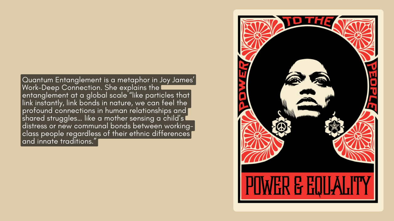 Like chaos and incoherence, resistance too can emerge from an entanglement. Thus, Quantum Entanglement is a metaphor in Joy Jamesâ Work-Deep Connection. She explains the entanglement at a global scale âlike particles that link instantly, link up the bonds in nature⌠we can feel the profound connections in human relationships and shared struggles⌠like a mother sensing a childâs distress or new communal bonds between working-class people regardless of their ethnic differences and innate traditions.â Joy is simply addressing or reviving âRevolutionary Loveâ as the universal link, for the working-class and especially women. She applies entanglement to ârevolutionary loveâ as a new commitment to ending oppressive systems, such as âanti-Blacknessâ or even xenophobic violence often instigated by fundamentalist icons and fascist leaders. The deal does not stop at fascism. Joy James lambasts the fallacy of âembracing democracy and then embracing a figure like Barrack Obama⌠the striving, the desire to succeed⌠we cannot sever ourselves from this type of violent, captured, corporate-police-democracyâ. America is a constant zone of siege and death?