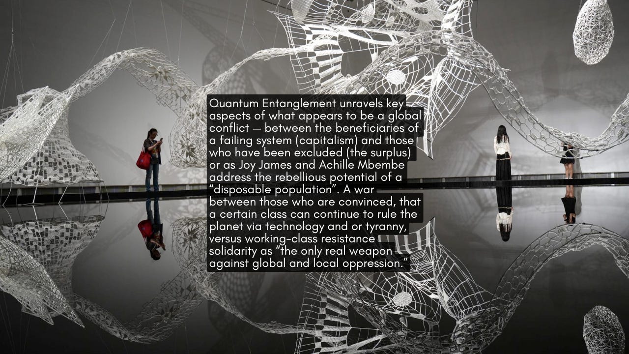 âQuantum Entanglementâ ties up the key aspects, of what appears to be a global conflict â between the beneficiaries of a failing system (capitalism) and those who have been excluded (as the surplus) or as Joy James and Achille Mbembe address the rebellious potential of a âdisposable populationâ. A war between those who are convinced, that a certain class can continue to rule the planet via technology and or rule-of-tyranny, versus working-class resistance â universal solidarity as âthe only real weapon against global and local oppression.â (Fred Hampton, Revolutionary Socialist).