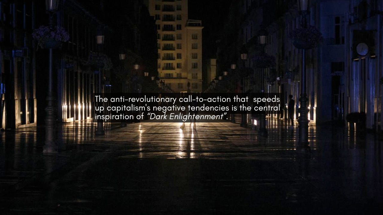 Dark Enlightenment and Accelerationism. Referred to as "the Cathedral", Neo-reactionaries refer to current liberal society, legacy media, reform based institutions and key figures on the Left, akin to a global congress, or worse a âPuritan Churchâ with âfalse goals of egalitarianism and democracyâ (Mencius Moldbug, 2009) or âthe deeper synopsis of the cathedralâ (Nick Land, 2004). That such a âCathedralâ is the main accomplice of downfall, of 20th-century western democracy, liberal societies and the overall prospects of western domination. âThe decline of the modern state⌠temporary power wielded by the less abled, by feminists, socialists, by the progressives, by pedophiles in high places, by Marxist intelligentsia and radical reformersâŚâ (Bronze-Age Pervert, 2021). No doubt, that Bronze-Age Pervert is a racist messianic figure, who is most popular with English-speaking disenfranchised white men. The âanti-revolutionary call-to-action⌠to speed up capitalism's negative tendenciesâ is the central inspiration of âDark Enlightenmentâ. African scholar, Achille Mbembe paraphrases this new imposed reality as the âAge Of Negative Messianismâ.
