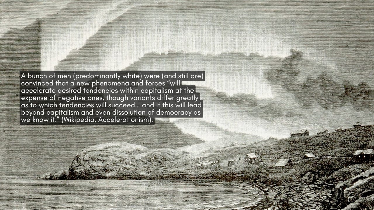 Circa 2005, Nick Land along with a radical group of thinkers, writers, philanthropists and who experimented in âconceptual productionâ gave way to Accelerationism. This new and so called âanti-human versus post-humanâ conundrum came about as a confluence of various streams: of futurism, techno-science, philosophy, mysticism, numerology, complexity theory, singularity and also tons of mediocre science / climate fiction. A bunch of men (predominantly white) were (and still are) convinced that a new phenomena and forces âwill accelerate desired tendencies within capitalism at the expense of negative ones, though variants differ greatly as to which tendencies will succeed⌠and if this will lead beyond capitalism and even dissolution of democracy as we know it.â (Wikipedia, Accelerationism).