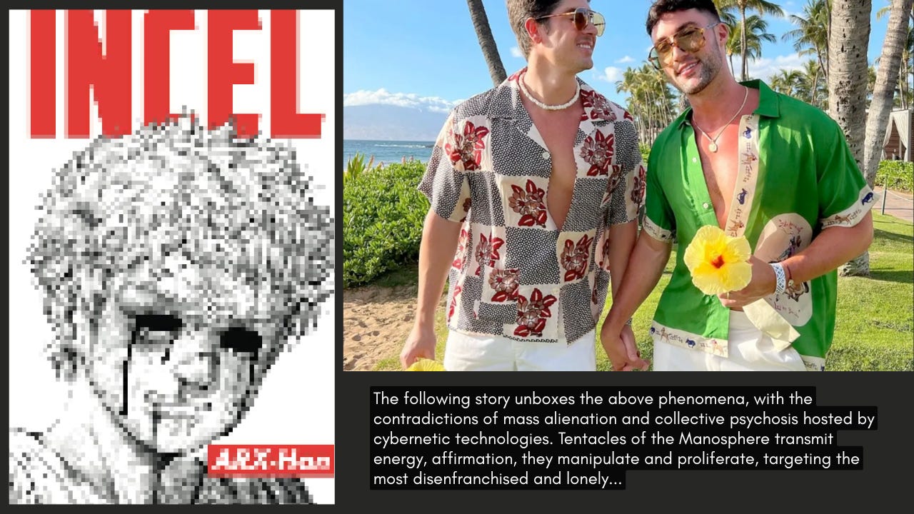 The following story unboxes the above phenomena, with the contradictions of mass alienation and collective psychosis hosted by cybernetic technologies. Tentacles of the Manosphere transmit energy, affirmation, they manipulate and proliferate, targeting the most disenfranchised and lonely. In its gravity so intense that nothing, not even reason and reality can escape, akin to the phenomena of a âBlack Holeâ that is consuming the lives of millions of teenagers and young men. A space where alienation, philosophy, morality, convention, opinion, speculation, hate and anxiety all merge into violent rhetoric, and at times deeply misogynistic advice and motivation.
