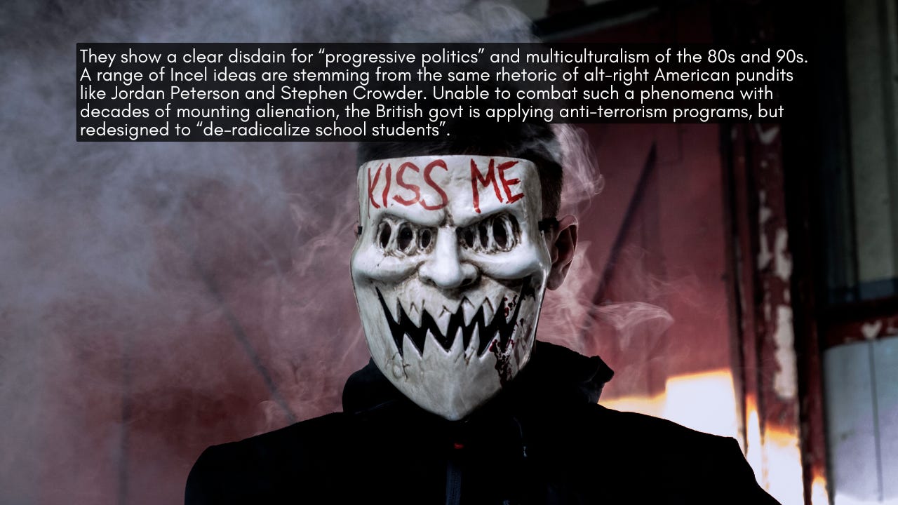 âInceldomâ is focusing on defeatism, fatalism, and biological determinism for conventionally unattractive men. Many influencers have internalized Neo-Eugenic motivation (Steve Sailer) aimed at the ânot good looking women and menâ. In recent Right-Wing watch, amongst those users of Incel forums popular in the UK, many also follow right-wing conspiracy theories surrounding climate change, gyno-centric health issues, immigrants and virology. They show a clear disdain for âprogressive politicsâ and multiculturalism of the 80s and 90s. A range of Incel ideas are stemming from the same rhetoric of alt-right American pundits like Jordan Peterson and Stephen Crowder. Unable to combat such a phenomena with decades of mounting alienation, the British govt is applying anti-terrorism programs, but redesigned to âde-radicalize school studentsâ. But private solutions also claim to sanitize the influencer economy, where experts are âcrafting standout creative and strategic marketing that deeply influences.â (redpill agency). Yet all such impositions and techniques cannot contain the disruption and simulation (of reality).