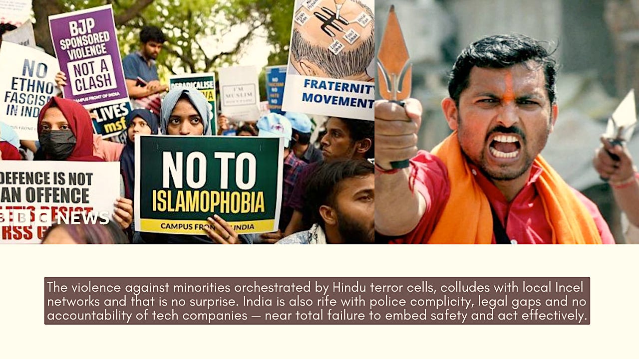 The Incel groups in India are inspired first, by the hideous objectification of women and girls in Bollywood, but the situation gets worse. Social media and personal communications are weaponized in a mounting crisis underpinned by discrimination. The violence against minorities orchestrated by Hindu terror cells, colludes with local Incel networks and that is no surprise. India is also rife with hate based nationalism, police complicity, legal gaps and no accountability of tech companies â near total failure to embed safety and act effectively. âIncels are typically framed in terms of the threat they pose to others, but our findings suggest they may be just as dangerous, if not more so, to themselves.â (Swansea University).
