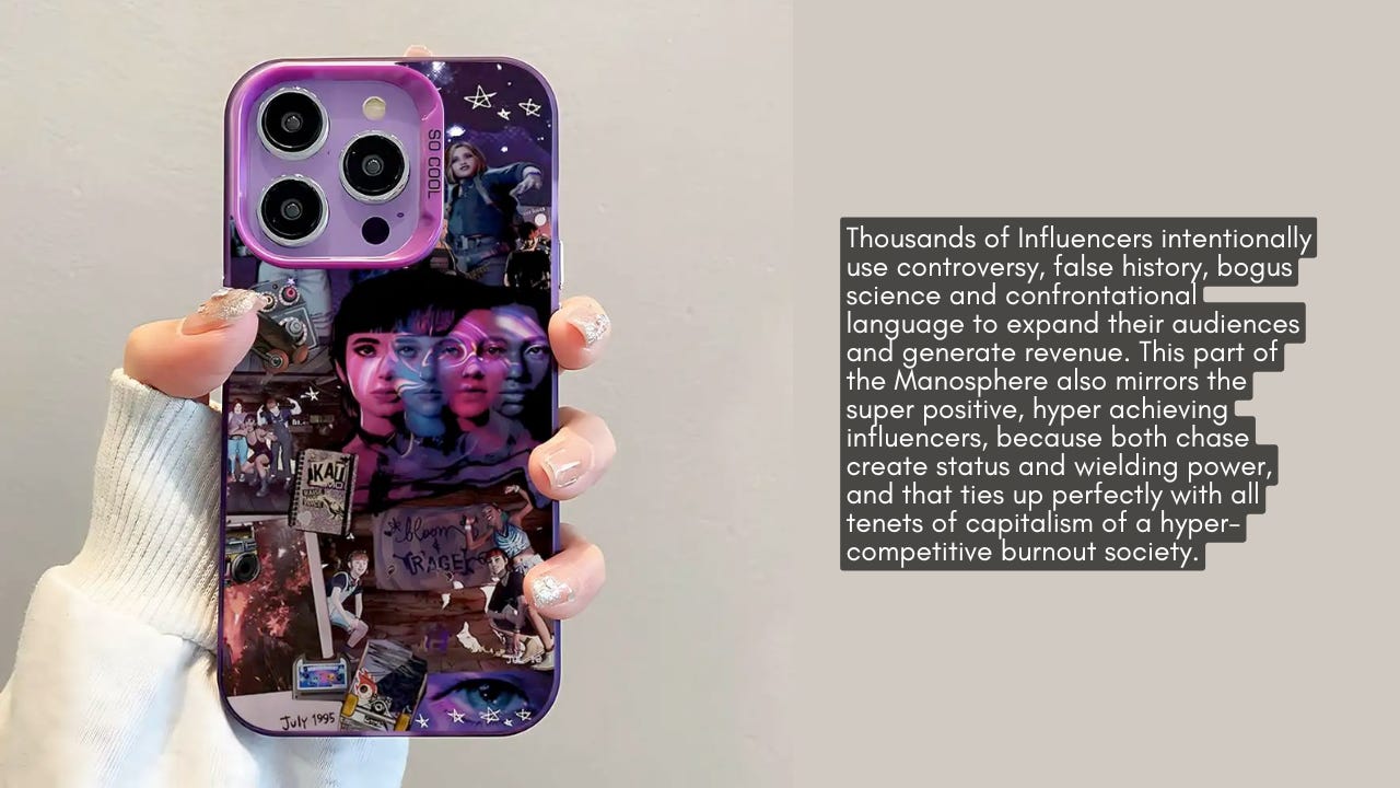 One cannot stick with just âviolent rhetoricâ and ignore the obvious confrontation of egos. Netflix or Theroux cannot dive any deeper into the Manosphere, not beyond the utterly obvious, the popular cult-figures with their daily routine â the live streaming of achievement, of body, wealth, property, fancy cars, latest girlfriend and the occasional scandal. Thousands of Influencers intentionally use controversy, false history, bogus science and confrontational language to expand their audiences and generate revenue. This part of the Manosphere also mirrors the super positive, hyper achieving influencers, because both wish to create status and wield power, and that ties up perfectly with the tenets of capitalism, and the subsequent hyper-competitive burnout society. âUncovering Incelsâ a new series by Apple TV placates the subjects, into the same no-brain binary of conflict between neoliberal achievement versus conservative anti-feminism. A neoliberal rehabilitation of the Incel. No less preposterous is the technique called Looksmaxxingâ â the Incel using a hammer on his face to be âmore attractiveâ (The Secret World of Incels). Shocking is the case of Sikh influencer, Nancy Grewal who was killed by white extremists, days after she published various videos âexpressing deep concern for her safety.â (Windsor, Ontario).